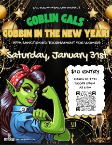 Ball Goblin Pinball Org proudly presents our next tournament of competitive flipperdom: GOBLIN GALS: GOBBIN’ IN THE NEW YEAR! Come out and participate in our fun knockout tournament for women. We are a friendly and inclusive group. Women and their significant other are welcome. The shop is not open for general free play on Goblin Gal Saturdays. The tournament is IFPA sanctioned, but you may opt out of IPFA if you wish.
