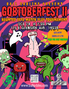 Back by popular demand, the Ball Goblin Pinball Organization is proud to bring you the most BONE CHILLING and SCARETACULAR event of the season – GOBTOBERFEST II! The Halloween showdown to end all showdowns is back, once again at the infamous Glenside Machine Shop! Come and duke it out on machines from all eras such as classics like DRAGON, rarities like BANZAI RUN, and the latest in ~spooky thrills~ like EVIL DEAD.