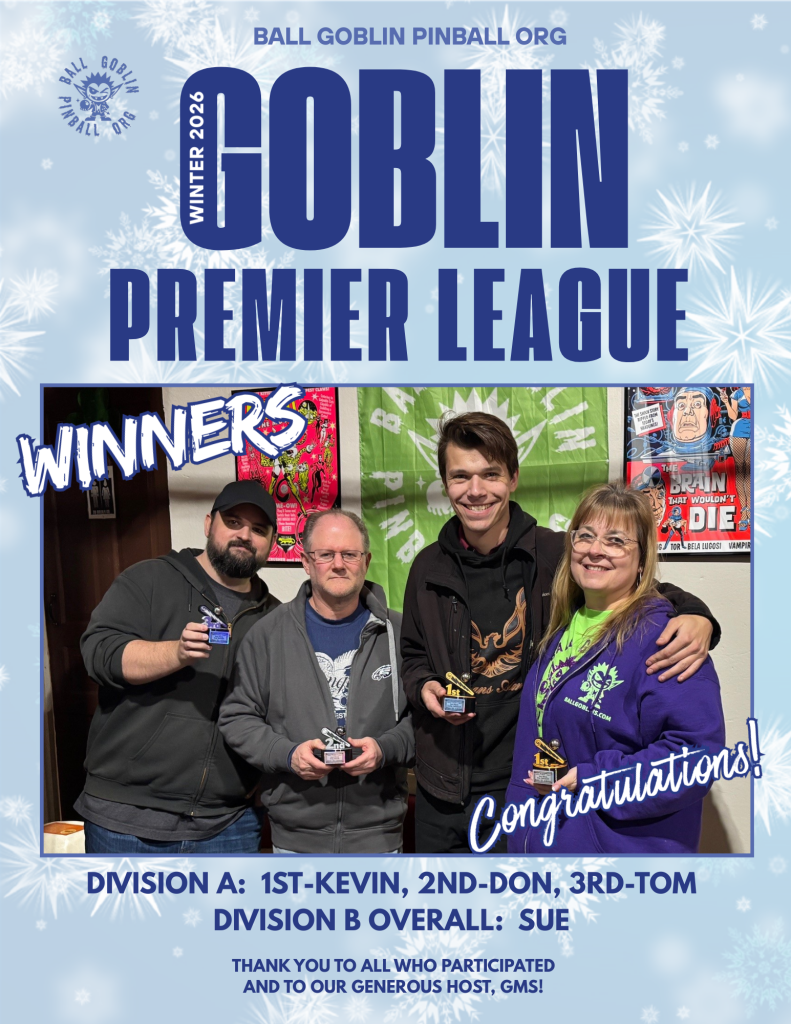 The Winter 2026 Goblin Premier League concluded on Friday, March 6, 2026 with the Division A and Division B playoffs. There were 8 players in Division A, and 15 players in Division B. Players battled it out in a PAPA-style format with banks consisting of three games each, which included an EM, solid state and DMD style, with an alternate game provided in case of any game malfunctions.